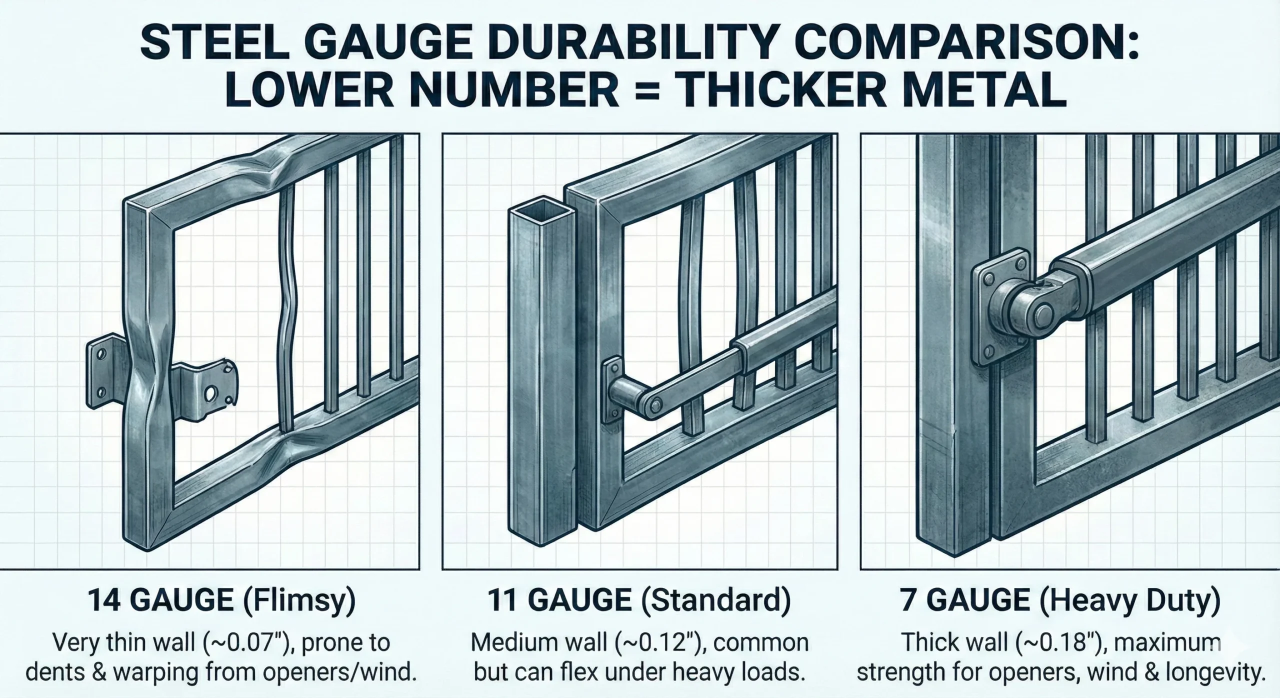 Technical illustration comparing the wall thickness of square steel tubing used for driveway gates. Shows the structural difference between flimsy 14 gauge, standard 11 gauge, and the heavy-duty 7 gauge steel used by JDR Metal Art.